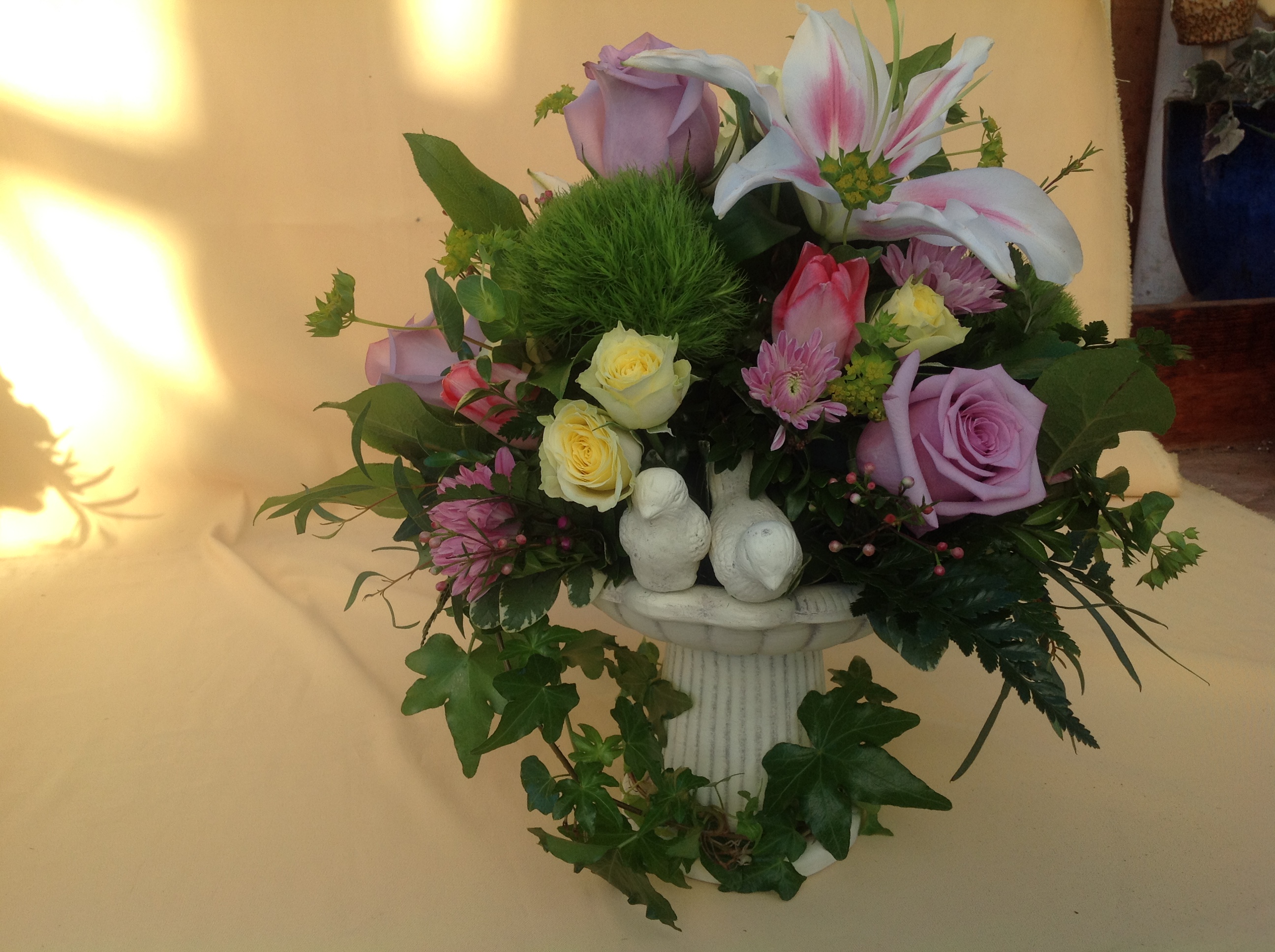 Filled with roses a lilly and colorful seasonal flowers.